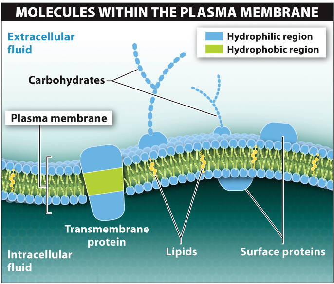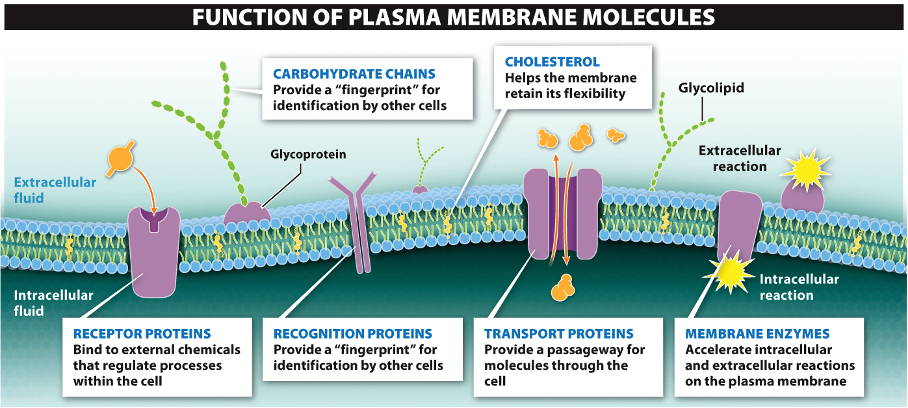 Various proteins embedded in the plasma membrane serve many functions; for example, carbohydrate chains may bind to a protein to form a glycoprotein that serves as an identification tag, unique to each type of cell.