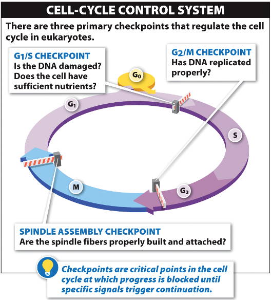 The checkpoints at G1, G2, and M (mitosis) ensure that a particular phase is completed before advancing to the next phase.