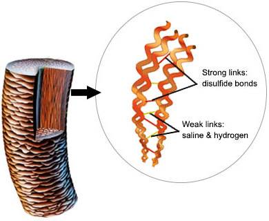 Incomplete dominance in hair textture: a heterozygote has wavy hair. The amount of curl is determined by the number of disulfide bonds between keratin molecules.
